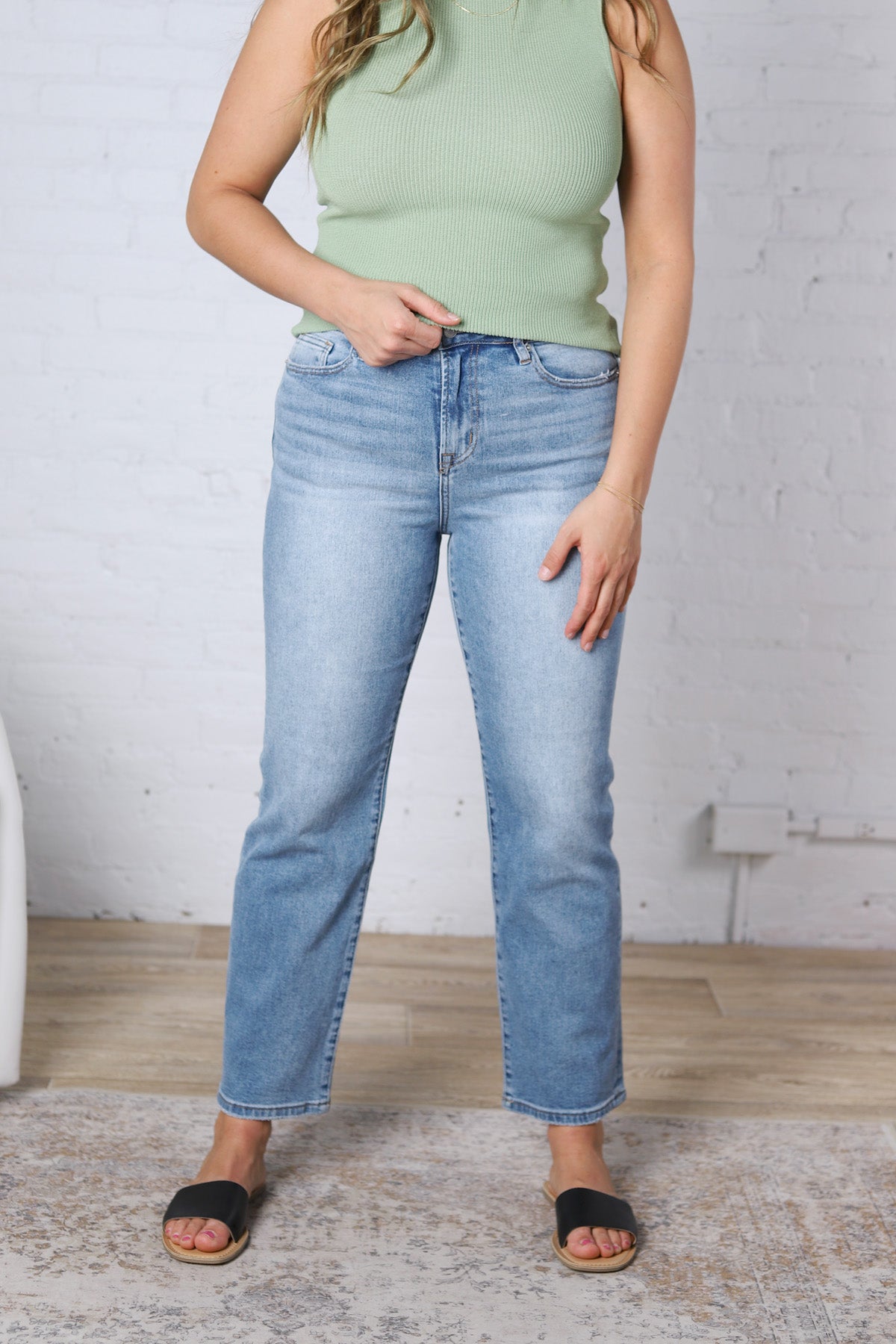 The vintage light wash adds a soft, lived-in character without distressing, keeping the finish clean and versatile. Whether styled with a fitted tank and sandals or layered with a blazer and sneakers, these jeans move seamlessly from casual days to elevated moments.
