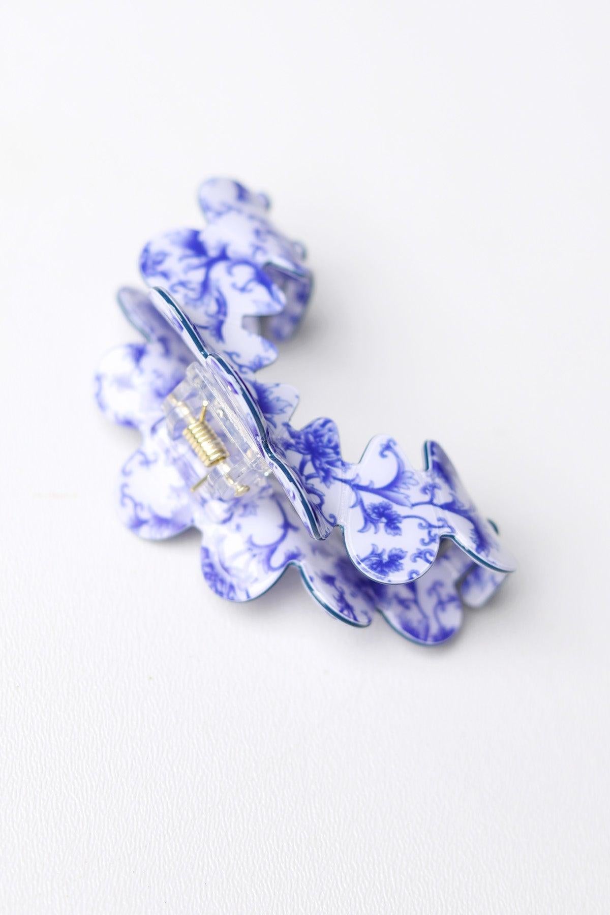 Add a touch of timeless elegance to your everyday hair styling with the Clara Vintage Porcelain Half Moon Claw Clip. Designed with a classic half-moon silhouette, this claw clip features a delicate porcelain-inspired toile pattern in rich royal blue—bringing vintage charm and refined beauty to any look.