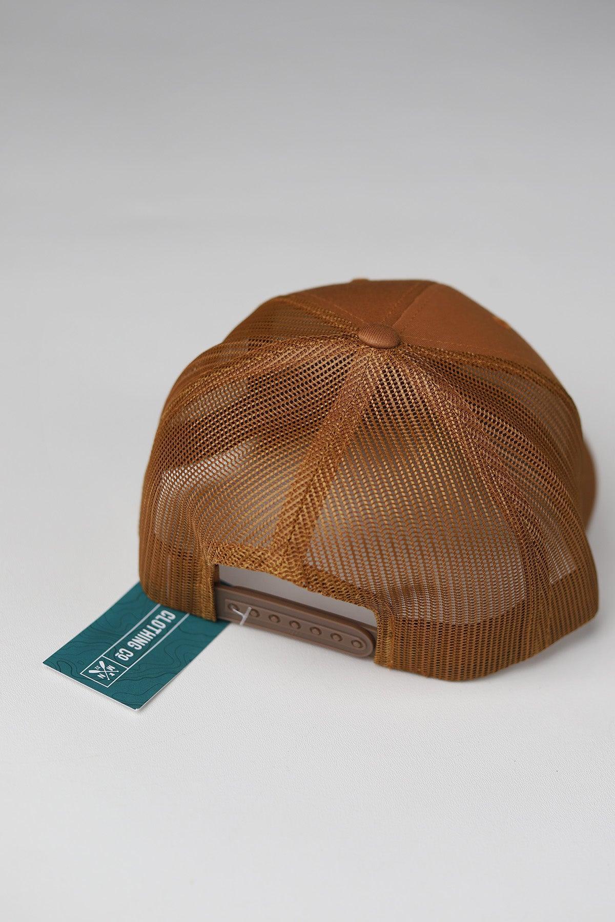 Caramel snapback with a PU leather circle patch featuring our iconic MN paddle logo in black with the state silhouette and the number 32, a subtle nod to Minnesota being the 32nd state to join the Union.