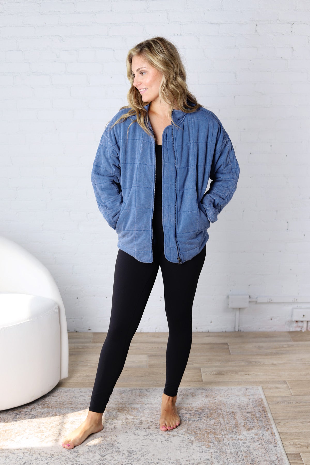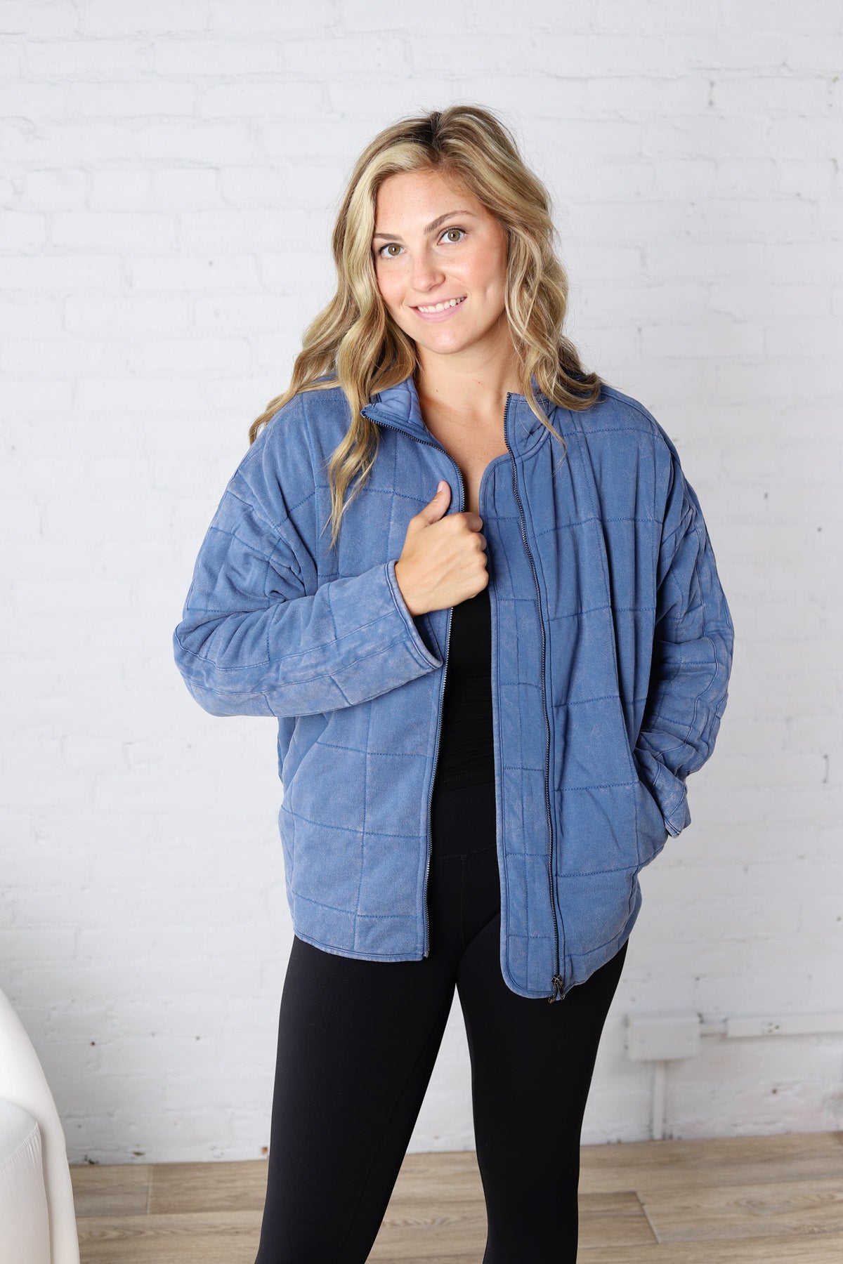 The Ellery Quilted Jacket is the perfect blend of comfort and style. Designed with an oversized, relaxed fit, this jacket offers a laid-back yet effortlessly chic look. The quilted texture adds warmth and dimension, making it an ideal layering piece for cooler days. Whether you're running errands or heading out for a casual outing, the Ellery Quilted Jacket provides both coziness and modern appeal. Available in Sky Blue and Denim.