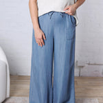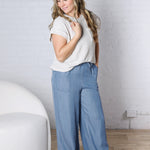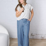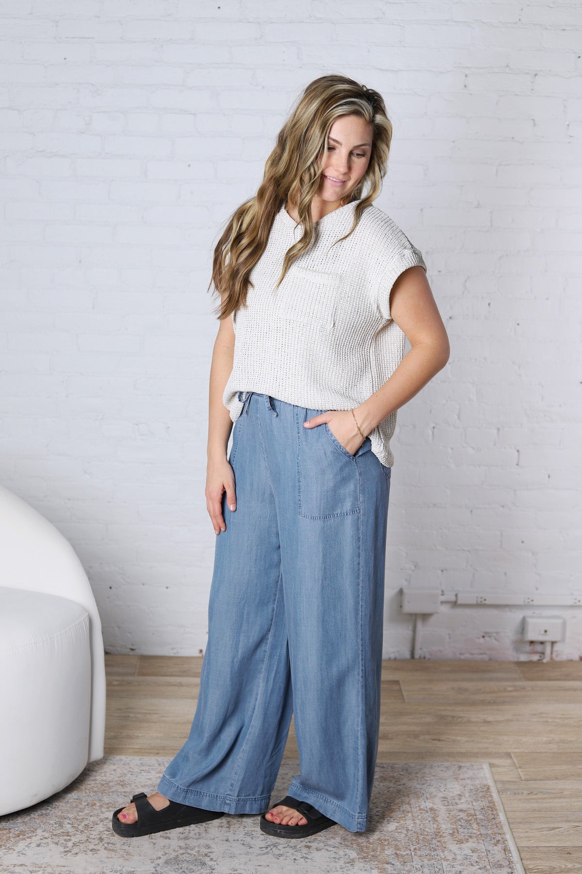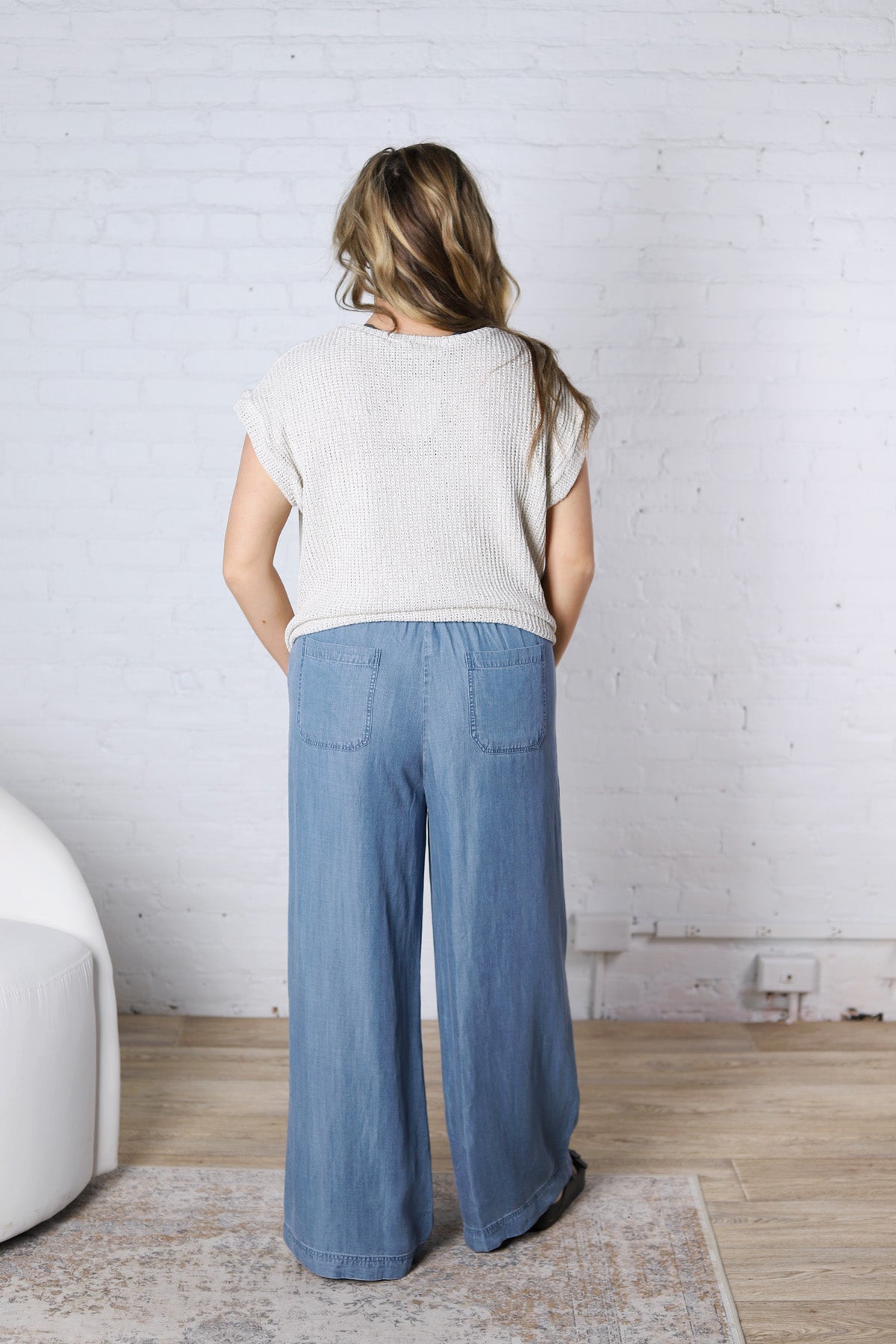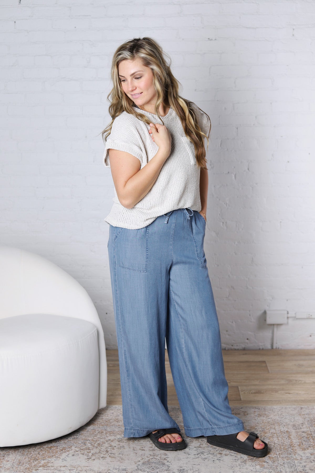 Crafted from a soft Tencel-blend chambray, these pants feel lightweight and breathable while still looking elevated. The high-rise fit, elastic waistband, and adjustable drawstring make them effortless to wear, whether you’re dressing them up with a blouse or keeping things casual with a tee or lightweight sweater.