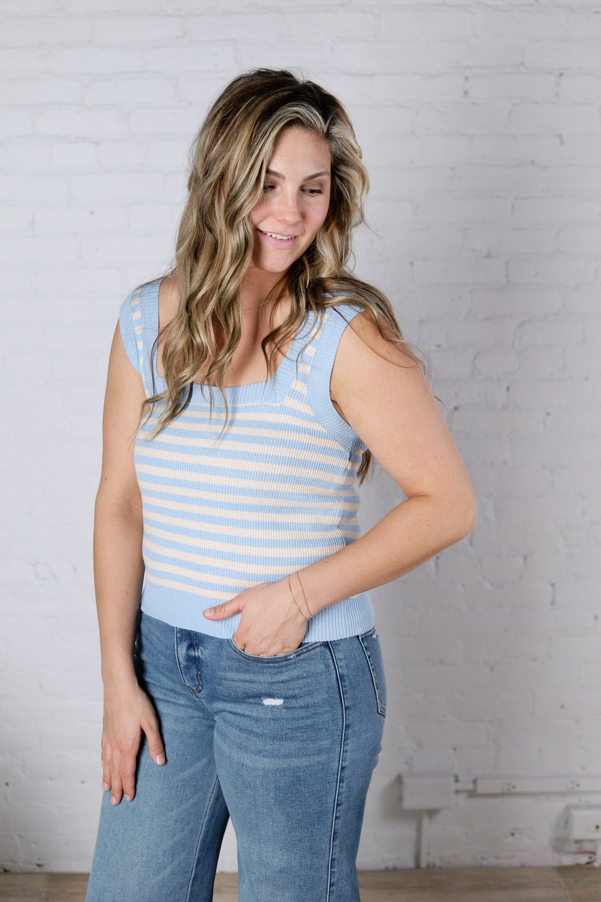 Clean lines and playful stripes come together in this effortless knit tank designed for easy, everyday styling. The Leny Striped Square Neck Tank features a soft, lightweight sweater knit with a flattering square neckline that adds a modern touch to a classic silhouette.