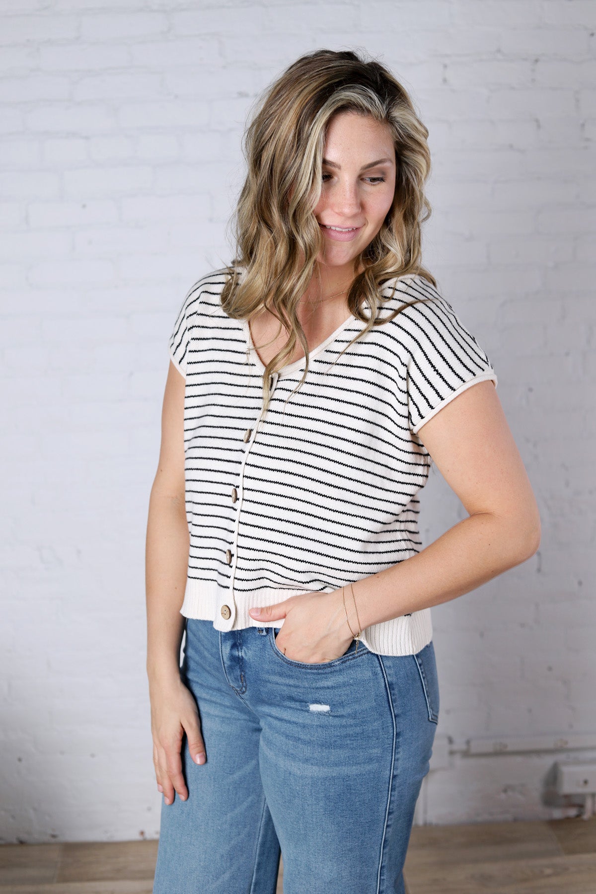 Effortlessly classic with a modern twist, the Maxine Short Sleeve Cardigan is the perfect lightweight knit for everyday layering. Designed with a flattering scoop neckline and button-down front, this piece offers timeless versatility with an easy, relaxed feel. The subtle raw edge trim adds a touch of texture, while the stripe pattern keeps the look clean, chic, and endlessly wearable.