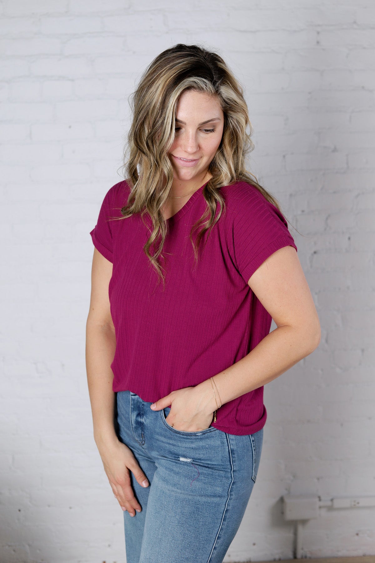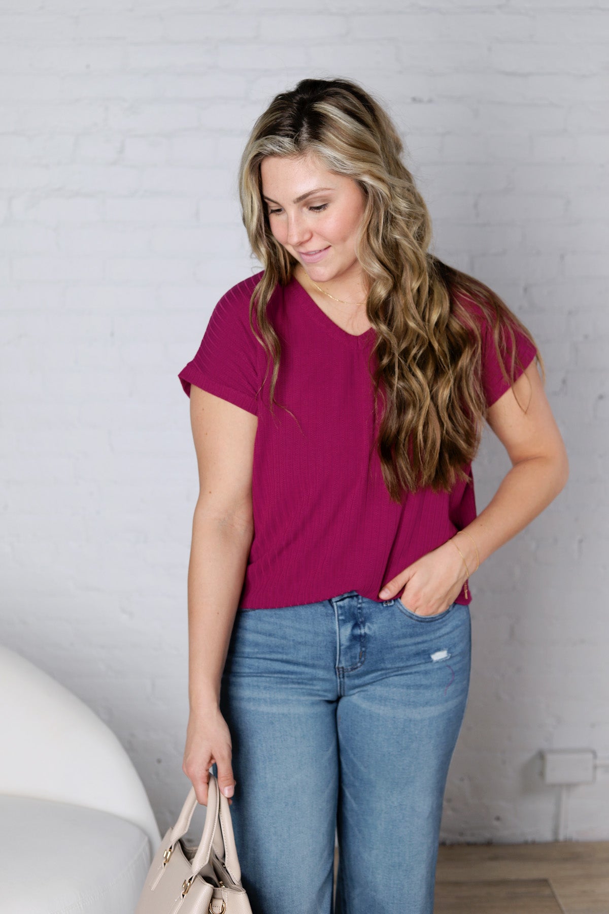 Effortless comfort meets casual polish in the Nelly Top. Crafted from a breathable ribbed knit with the perfect touch of stretch, this short-sleeve essential features a flattering V-neckline and cuffed sleeves for that rolled-and-ready finish. The vertical rib texture adds subtle structure, while the relaxed silhouette makes it easy to dress up or down.