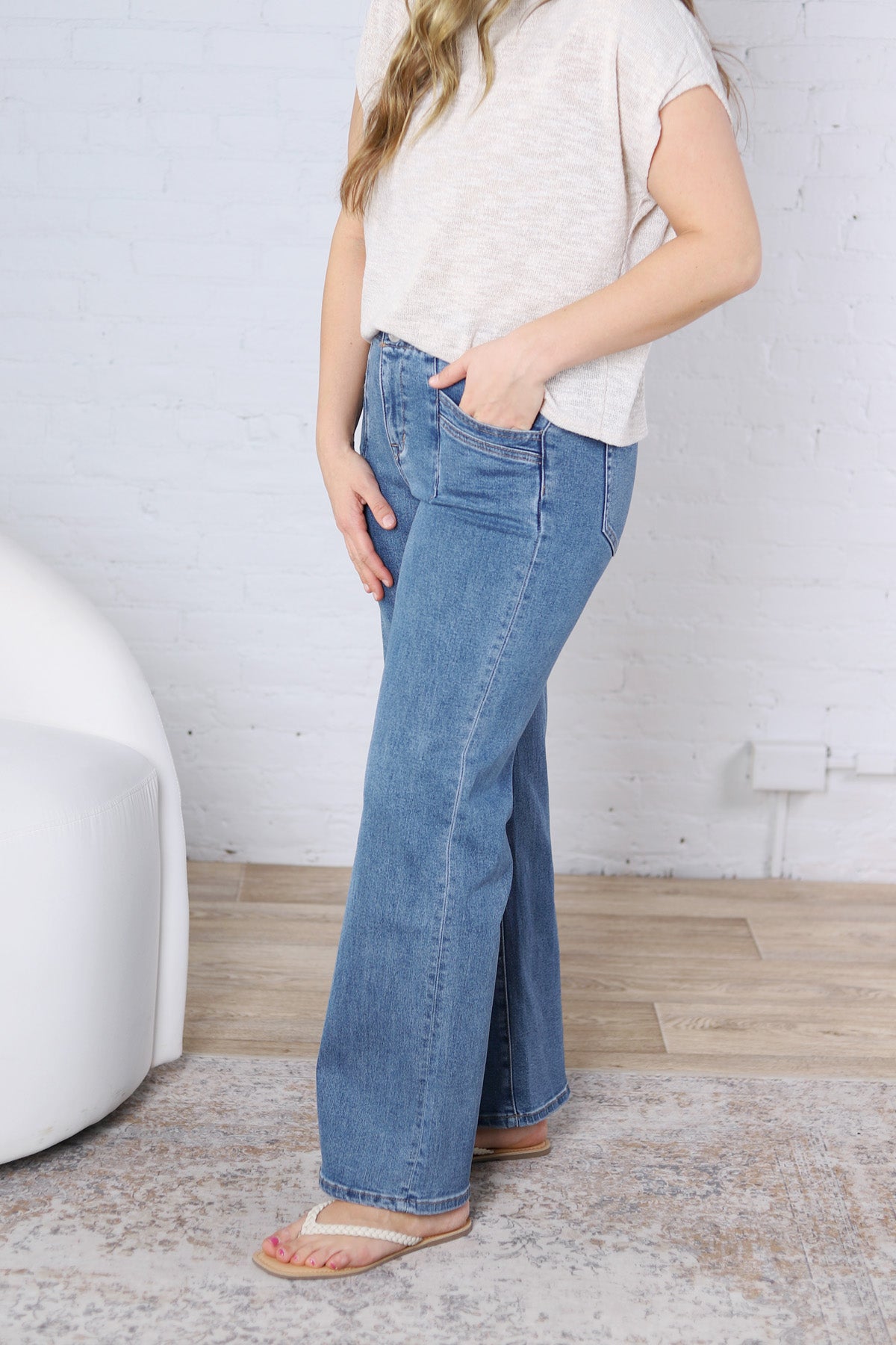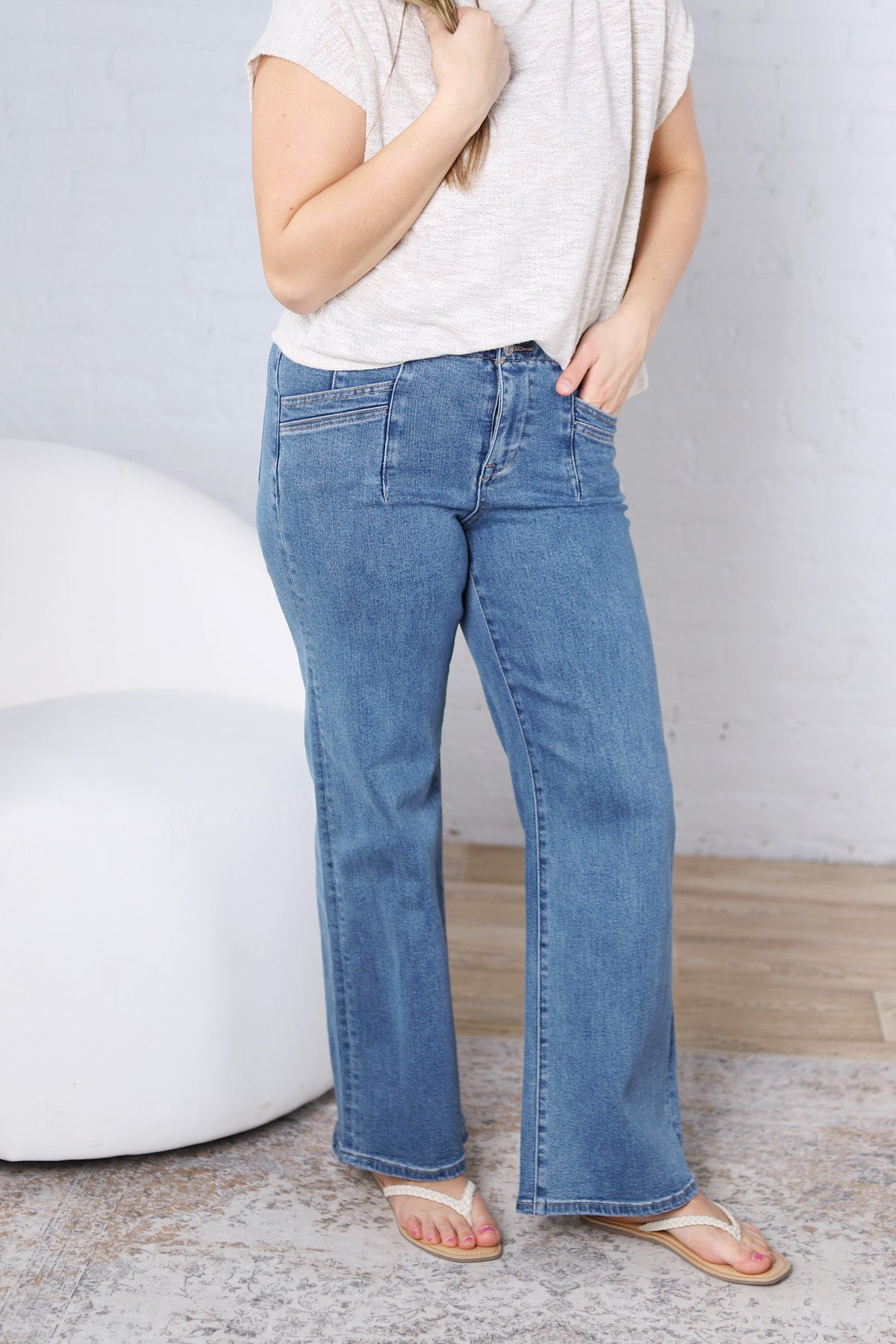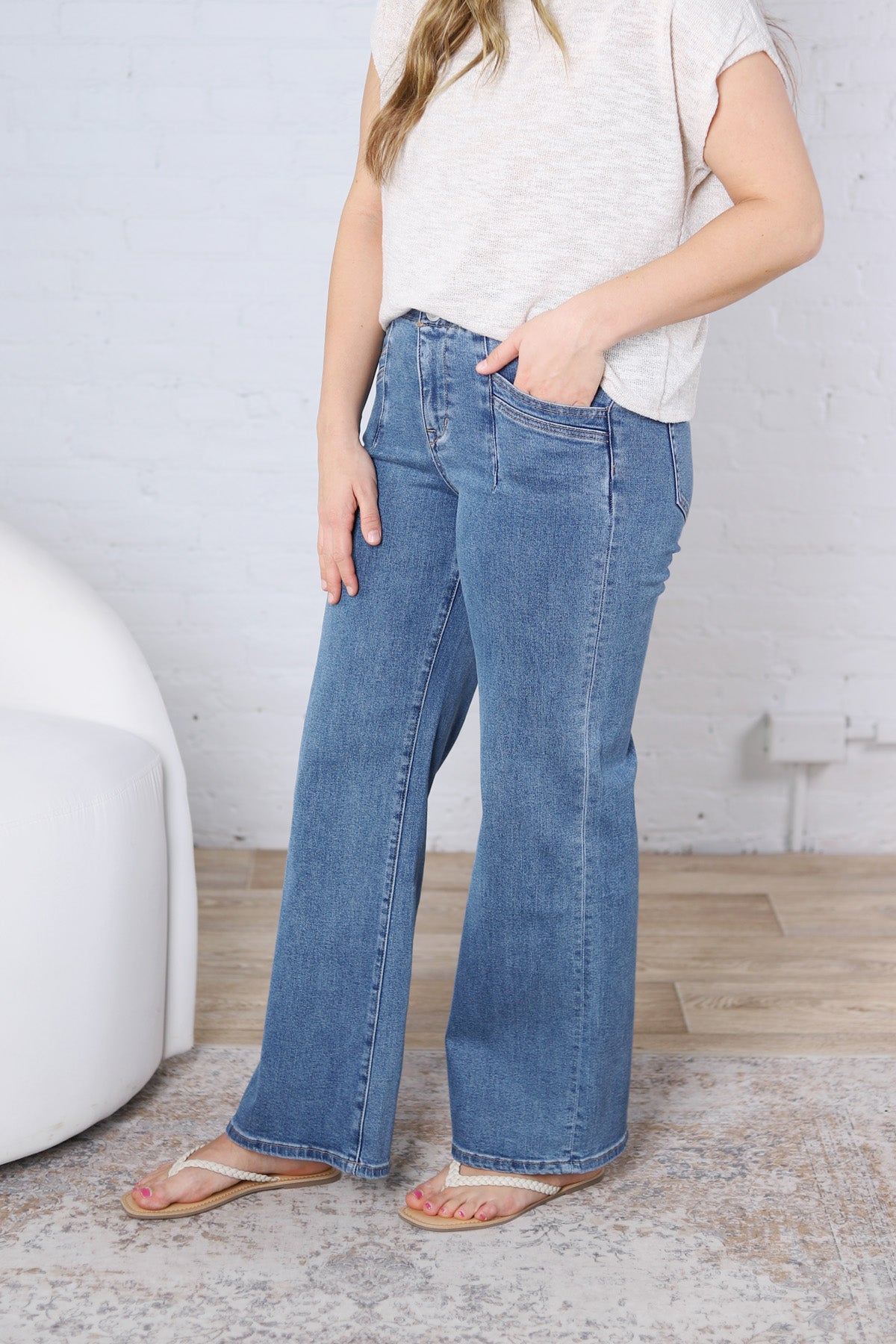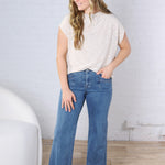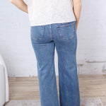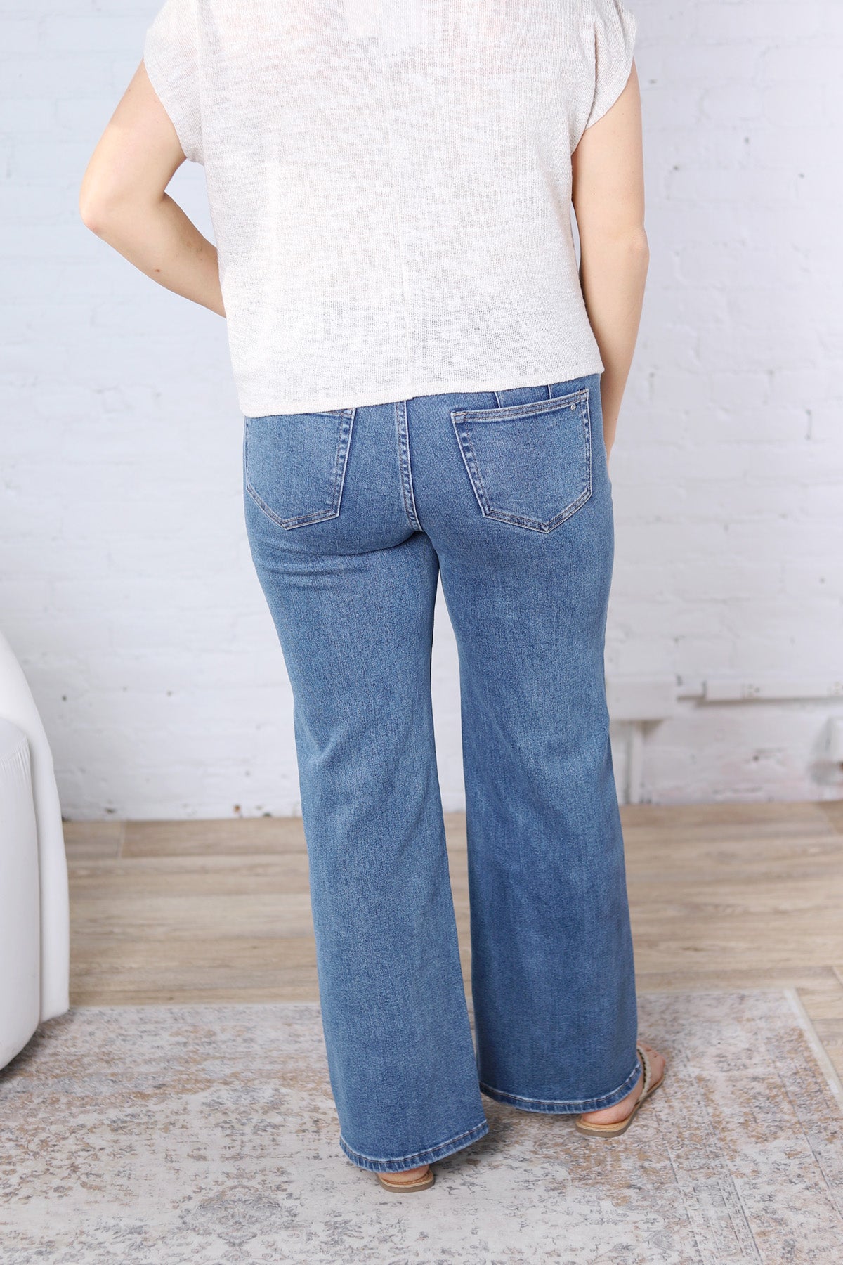 Timeless structure meets modern edge in the Odette jean. Featuring a flattering super high rise and wide leg silhouette, this style is elevated with a chic double button waistband that cinches in all the right places. The clean medium wash makes it a seasonless staple, while the wide leg creates effortless elongation — perfect for pairing with fitted tops, cropped knits, or blazers. Finished with just the right amount of stretch for comfort that lasts all day.