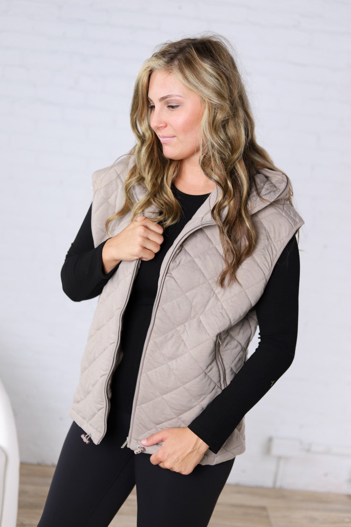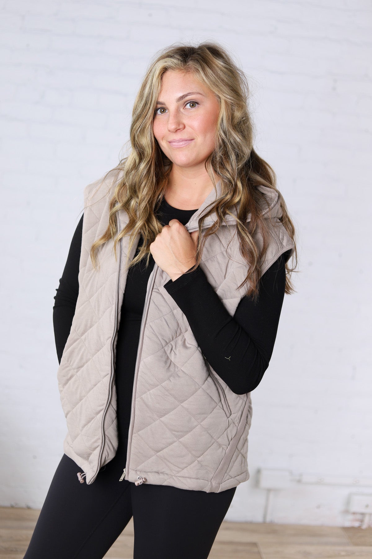 Stay cozy in style with the Perrin Quilted Hoodie Vest — a pillowy-soft, sleeveless layer designed for comfort and versatility. Featuring a relaxed, oversized fit and a cinched hem with adjustable stoppers, this vest lets you customize your silhouette for a perfectly effortless look. The quilted texture adds a modern touch, while the hood and side pockets keep it functional and chic. Perfect for layering over long sleeves or lightweight knits through changing seasons.