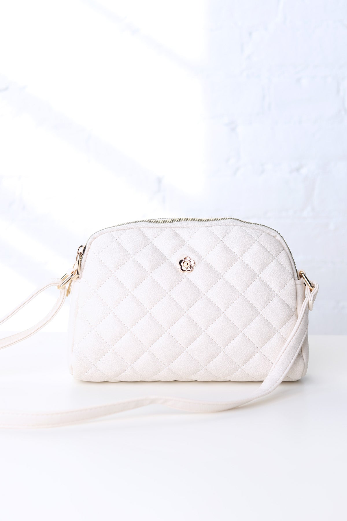 Tanya Crossbody with Quilted Pattern and Metal Flower Detail - Off White