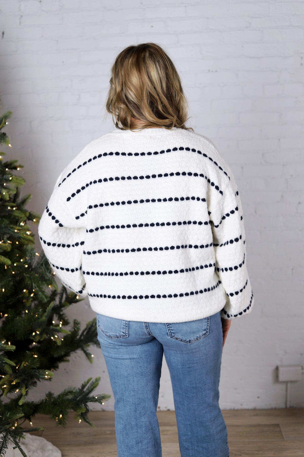 The white knit base offers a clean, fresh feel, while the dotted navy stripe detailing adds a modern twist to a forever-favorite pattern. Its crew neckline and ribbed cuffs keep the fit comfortable and flattering, making it easy to pair with denim, trousers, or your go-to winter boots.