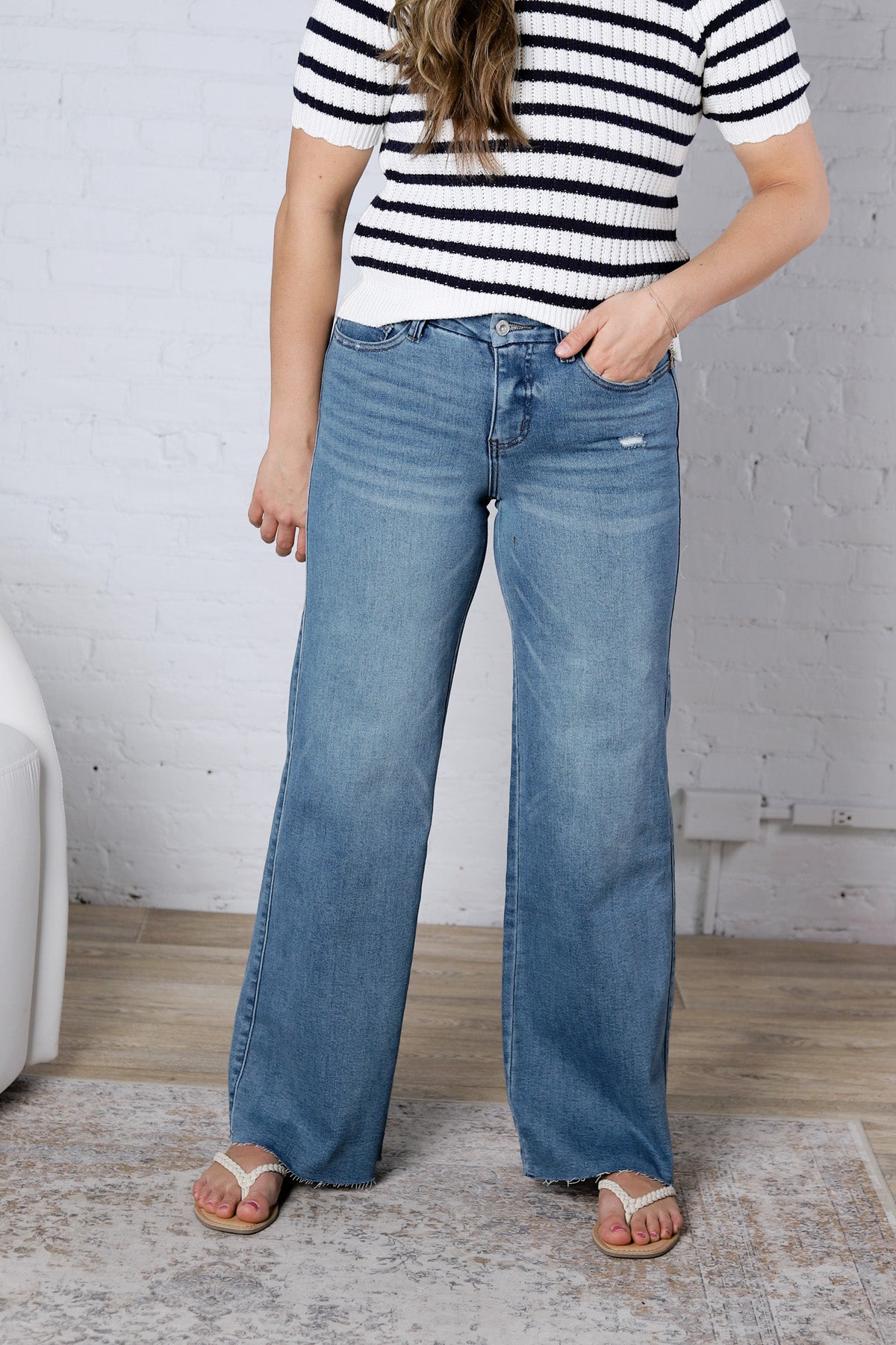 A slightly deeper take on your favorite wide leg fit, the Willa Mid Rise WL Vintage Wash Denim delivers the same flattering silhouette as the Scottie—now in a richer vintage blue wash. Designed with a comfortable mid-rise and an on-trend wide leg, these jeans combine timeless structure with everyday stretch for effortless wear.